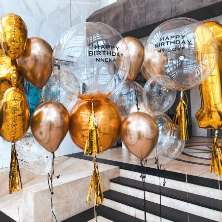 ₦240,000Our Gold Bling Set puts the fun in your party or event! This set comes in 1 orbs balloon, 2 large customised bubble balloons, 2 regular latex balloons, 2 number balloons, 4 regular confetti balloons and 5 chrome latex balloons. This set has 3 customisable balloons, comes helium inflated on 7 stands.