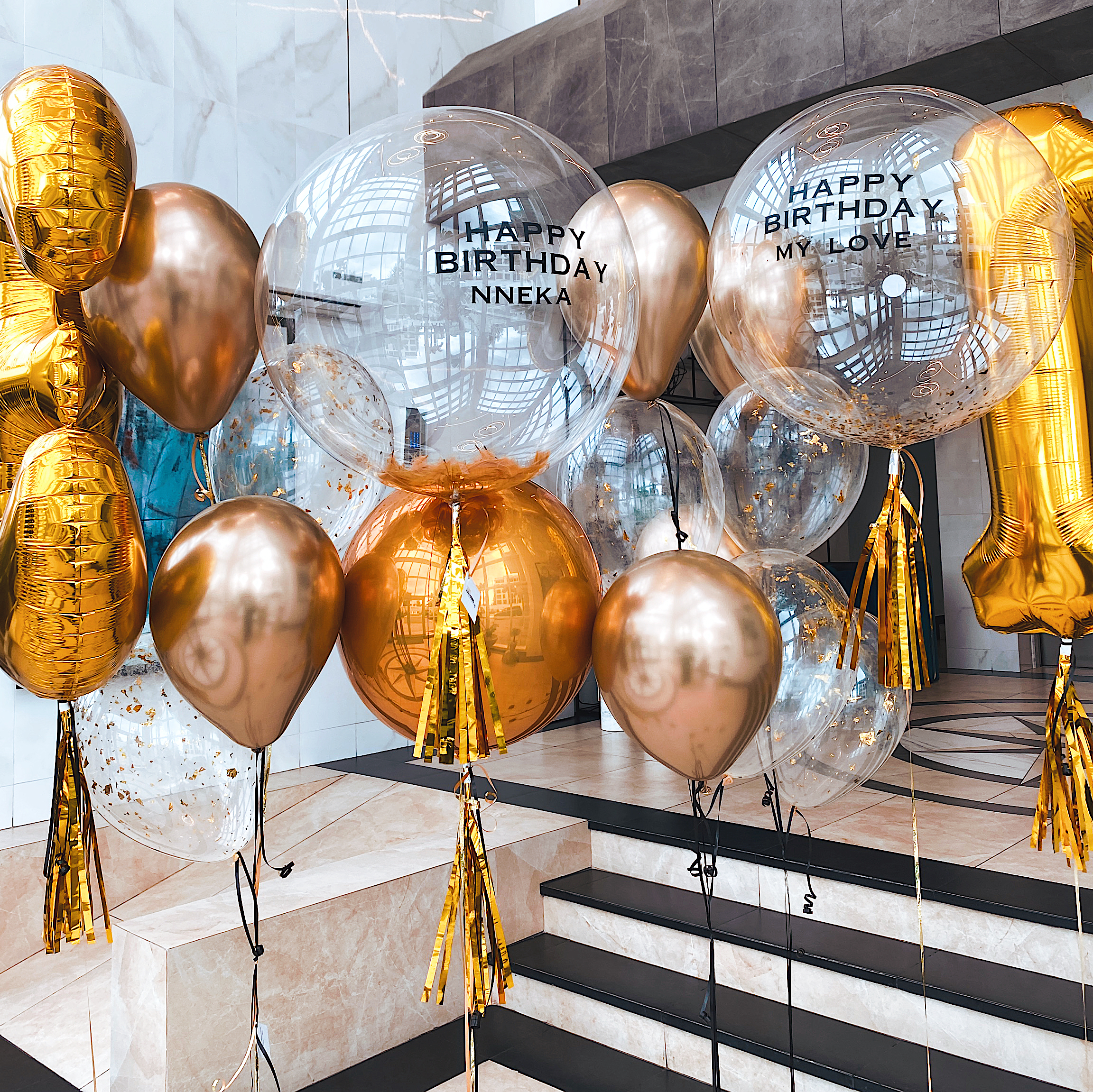 Our Gold Bling Set puts the fun in your party or event! This set comes in 1 orbs balloon, 2 large customised  bubble balloons, 2 regular latex balloons, 2 number balloons, 4 regular confetti balloons and 5 chrome latex balloons. This set has 3 customisable balloons, comes helium inflated on 7 stands.