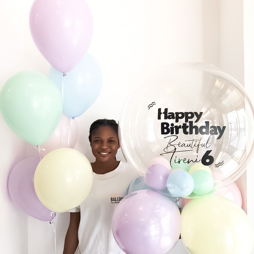 This beautiful long lasting bouquet comes with 1extra large 30 inch air inflated bubble with either confetti, mini balloons or feathers and a double layer base of balloons for extra height. Order this Bubble with helium inflated latex balloons to get the party started! Available in preferred colours and customization