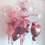 This gorgeous set is perfect for a special occasion for a loved one. It comes with 3 large 24 inch bubble balloons,  12 x 11 inch latex balloons, a metallic 16 inch orb and a heart shaped balloon. This set is delivered straight to you /your loved one helium inflated on 5 stands.